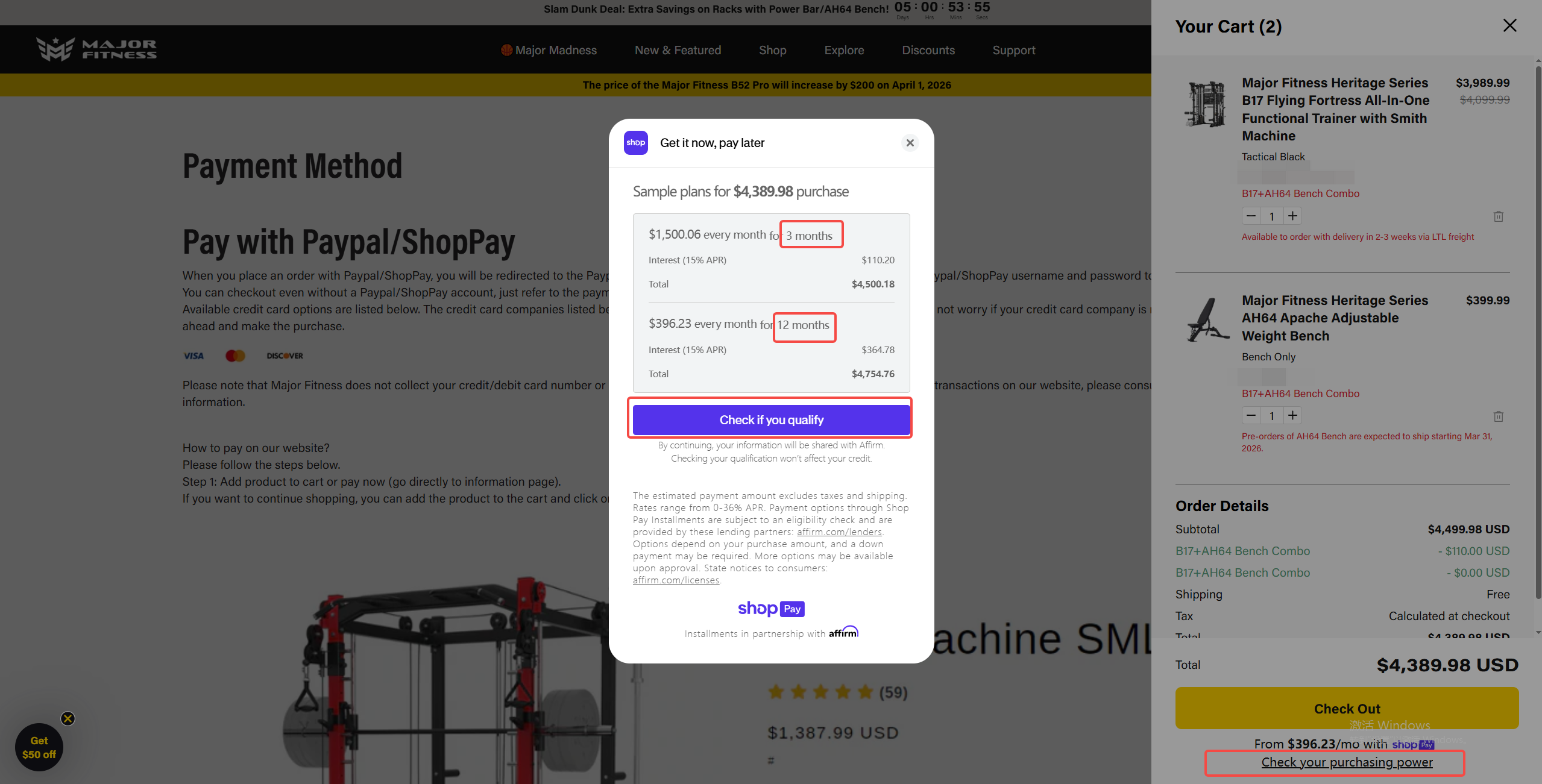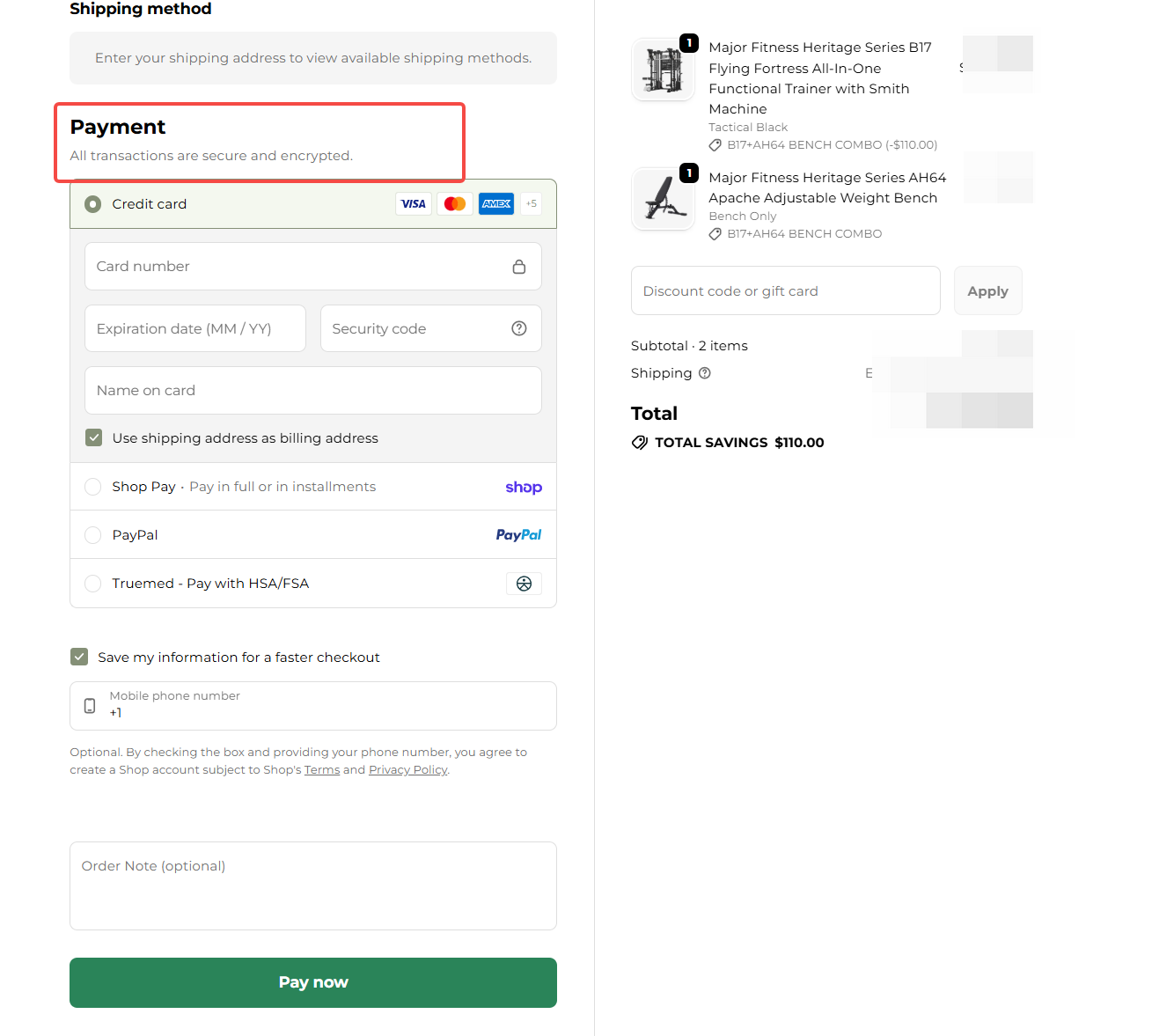 Please note that Major Fitness does not collect your credit/debit card number or personal information during the payment process. Additionally, each order only supports payment with a single bank card, and the use of multiple bank cards for a single order is not allowed. If you have any questions about transactions on our website, please consult your issuing bank.